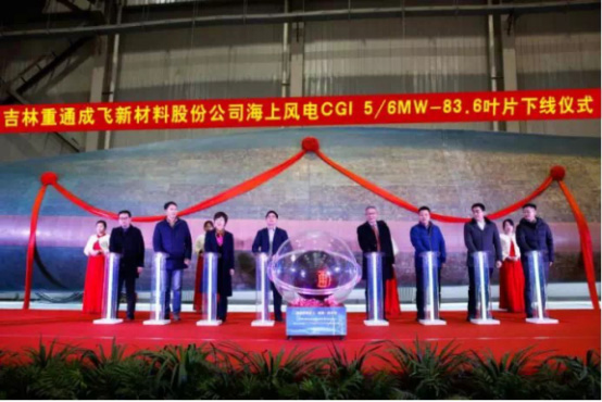 2018年2月6日,吉林重通成飛新材料公司開發(fā)出國內(nèi)最長海上風電CG15/6MW-83.6米葉片,并在江蘇如東成功下線..