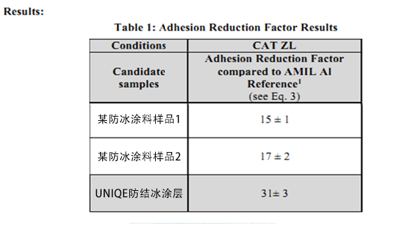 2、Uniqe涂料ARF為31, 冰的附著力降低90%以上。